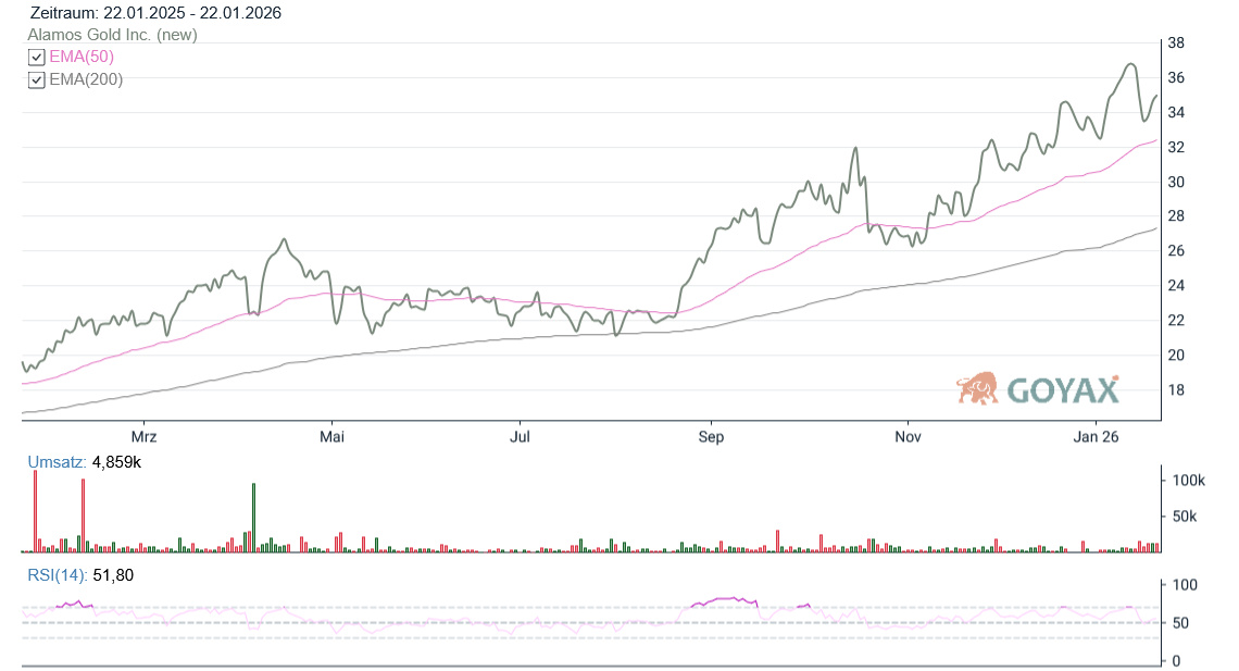 Im Februar will Alamos Gold eine neue Drei-Jahres-Guidance sowie die Expansion Study für den Island Gold District vorlegen. Diese Veröffentlichung dürfte entscheidend für die weitere Kursentwicklung sein. Gelingt es, die angekündigte Produktionssteigerung glaubhaft zu untermauern, könnte das Vertrauen der Anleger zurückkehren. Bleibt die operative Umsetzung jedoch erneut hinter den Erwartungen zurück, droht weiterer Bewertungsdruck.