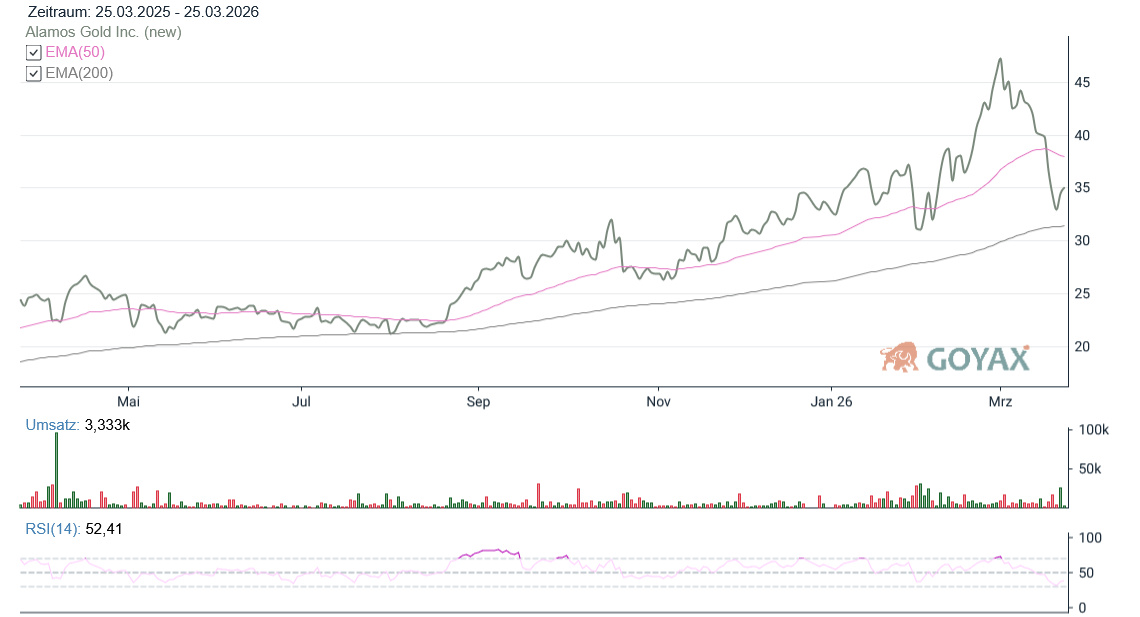 Wer sich für Alamos interessiert, interessiert sich auch hierfür. -> KW 12 2026 Gold und Silber im Crash Modus, welche Kräfte wirken ein? Dazu Blick auf Goldaktien Barrick, Newmont, Franco Nevada, Gold Fields und Freeport