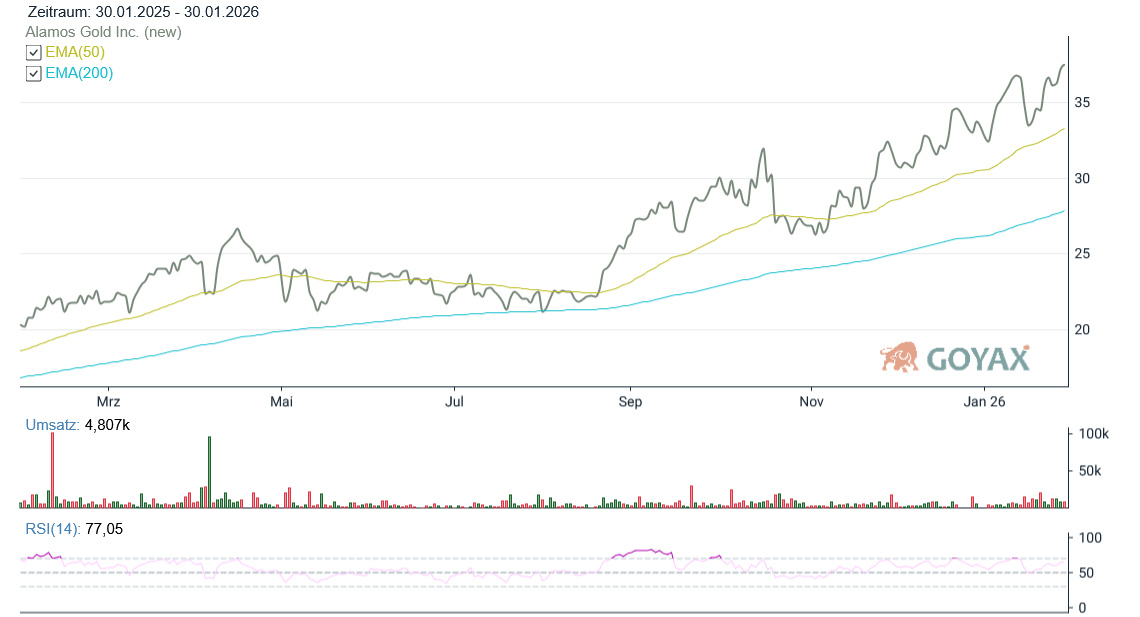 Wer sich für Alamos interessiert, interessiert sich auch hierfür. -> KW 04 2026 Gold auf Rekordjagd, Silber mit Meilenstein – außerdem haufenweise Kursgewinne bei Goldaktien Barrick, Newmont, Franco Nevada, Equinox Gold, Alamos Gold, Centerra Gold, Northern Star