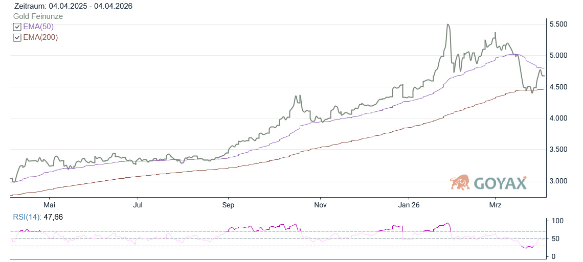 Aus technischer Sicht bleibt die Lage dennoch konstruktiv. Mit dem Schlusskurs unterhalb des EMA-50 bei 4.796,91 USD bleibt das kurzfristige Bild zwar eingetrübt, gleichzeitig bleibt Gold aber weiterhin klar über dem EMA-200 bei 4.461,41 USD. Damit ist der langfistige Aufwärtstrend weiterhin intakt.