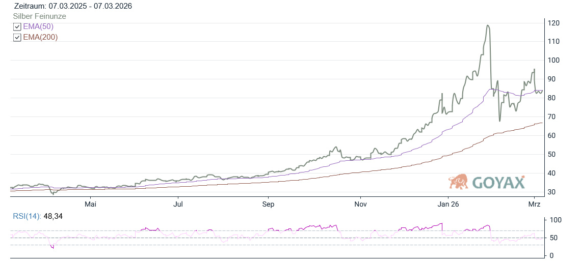 Aus technischer Sicht bleibt die Situation beim Silberpreis besonders interessant. Der EMA50 bei 84,06 USD fungierte zuletzt noch als Unterstützung, könnte nun jedoch zu einem kurzfristigen Widerstand werden. Diese Entwicklung deutet darauf hin, dass der Markt aktuell eine Konsolidierungsphase durchläuft.