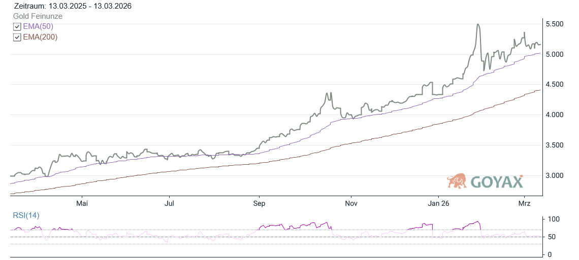 Zum Handelsschluss wurde der Goldpreis bei 5.160,14 USD festgestellt. Gegenüber dem Vortagsschluss von 5.186,27 USD entspricht dies einem Rückgang von 26,13 USD oder 0,50 %. Trotz dieses moderaten Rückgangs bleibt das Edelmetall weiterhin in einer stabilen technischen Ausgangslage. Auch heute morgen noch keine Preissprünge. Aktuell (08:08 Uhr) notiert Gold bei 5.168,35 USD.