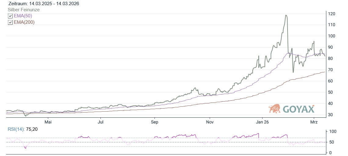 Beim Silberpreis liegt der EMA (50) aktuell bei 84,27 USD. Um 08:30 Uhr notierte der Silberpreis bereits nur noch auf 82,357 USD. Damit handelt Silber aktuell unterhalb seines 50-Tage-Durchschnitts, während Gold weiterhin deutlich darüber notiert. Dies könnte weiteren Verkaufsdruck in den Silbermarkt bringen.