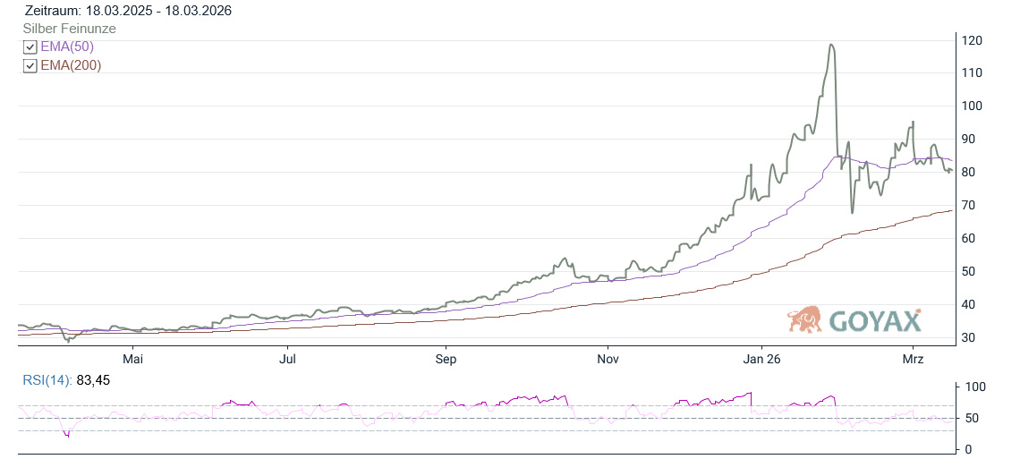 Im Gegensatz zu Gold präsentierte sich der Silberpreis stabiler. Silber bewegte sich in einer vergleichsweise breiten Spanne zwischen 77,1460 USD und 81,5735 USD, was einer Volatilität von rund 5,74 % entspricht.