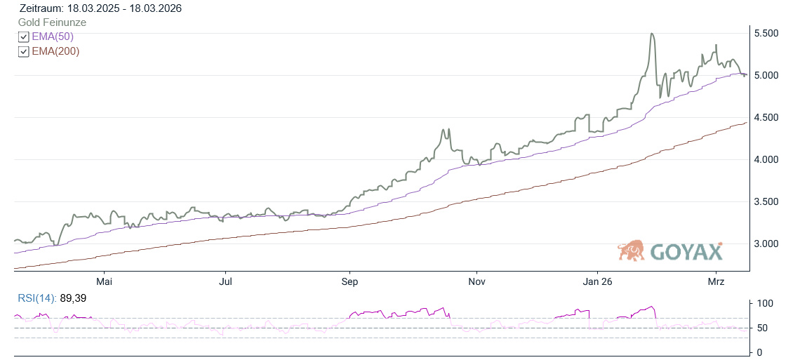Damit setzt Gold seine jüngste Schwächephase fort. Marktbeobachter führen dies vor allem auf Gewinnmitnahmen nach der vorherigen Rally sowie auf die weiterhin hohe Attraktivität des US-Dollars zurück. Auch befindet sich der Goldpreis damit knapp unterhalb der Marke des EMA (50). Dieser steht aktuell bei 5.018,03 USD. Dies könnte ein Indiz sein, dass der langanhaltende Aufwärtstrend gebrochen ist. Andererseits hatten wir auch zu Beginn des Novembers 2025 eine ganz kurze Phase, in der der Goldpreis mit dieser Marke kämpfte.