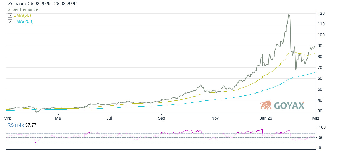 Trotz der leichten Schwäche bleibt Silber technisch im Aufwärtstrend. Der Kurs notiert oberhalb des EMA (50) bei 82,96 USD sowie deutlich über dem EMA (200) bei 65,41 USD. Die übergeordnete Trendstruktur ist daher weiterhin positiv.