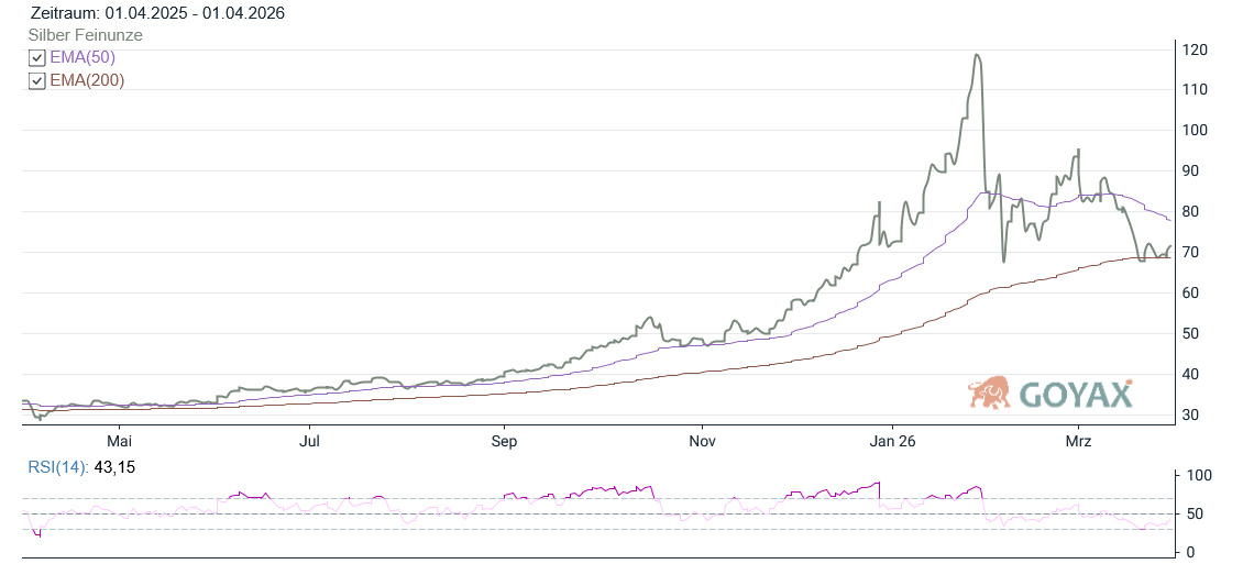 Beim Silber liegt der EMA 200 bei 68,81 USD und der EMA 50 bei 77,84 USD. Auch hier zeigt sich ein stabiler, aber weiterhin schwankungsanfälliger Markt.