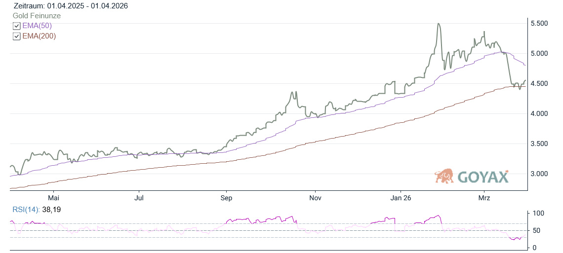 Technisch bleibt der mittelfristige Trend positiv. Der Goldpreis notiert weiterhin über dem EMA 200 bei 4.452,73 USD. Dies ist ein unterstützendes Signal. Der EMA 50 liegt mit 4.803,76 USD weiterhin deutlich höher und zeigt, dass der Markt noch Spielraum nach oben hat.