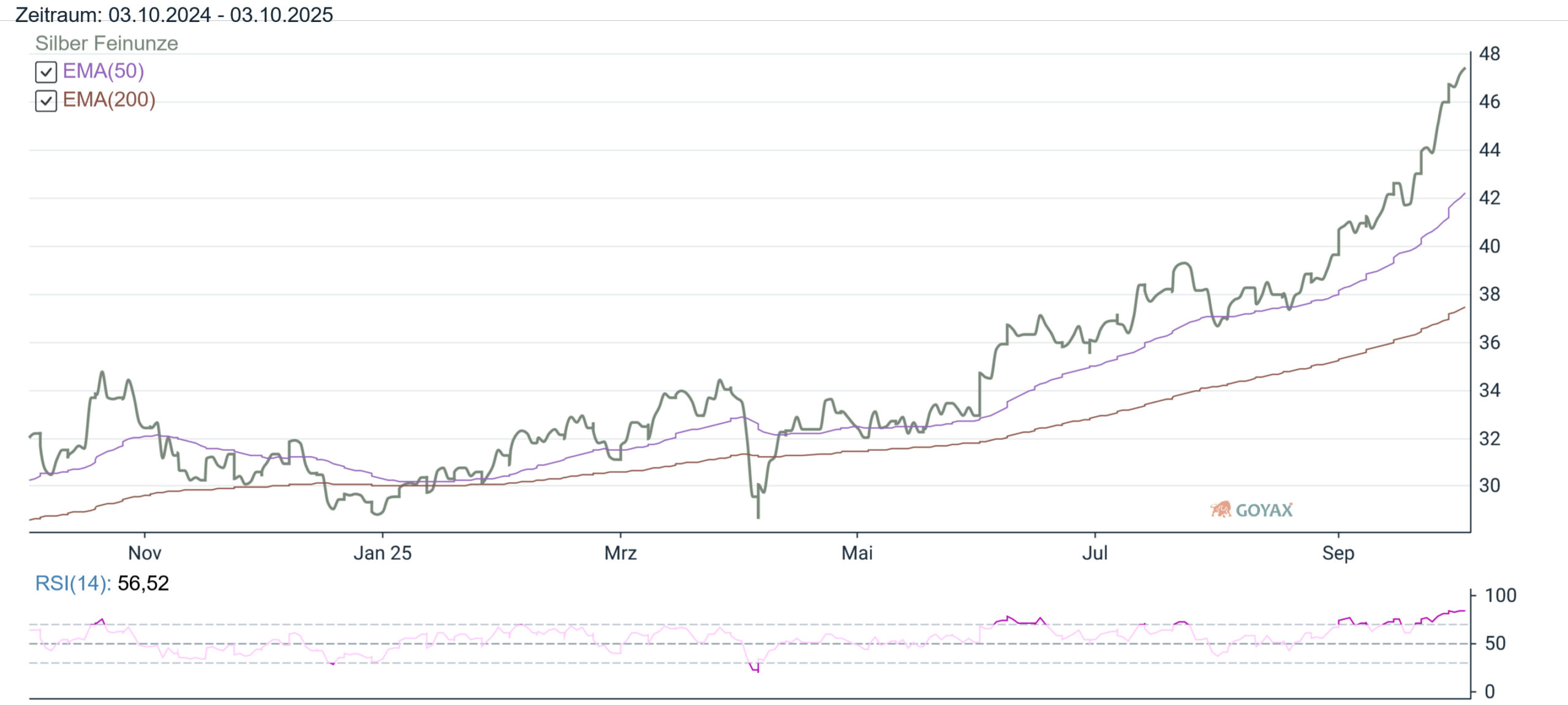 Der Preis für die Feinunze Silber pendelte am Mittwoch (01.10.25 ) zwischen 46,6435 USD und 47,83 USD. Somit erreichte der Silberpreis eine Handelsspanne von 1,18 USD oder 2,5352 % im Tagesverlauf. Der letzte Preis am Mittwoch (01.10.25 ) ist mit 47,3230 USD im Vergleich zum Vortag (46,6575 USD) deutlich höher. Somit beläuft sich das Plus auf 1,43% oder 0,6655 USD.