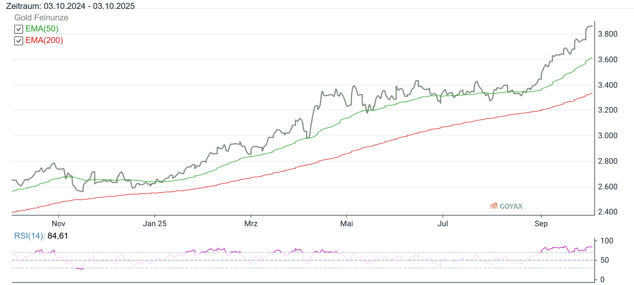 Mit den 3.895,33 USD, also mit dem Tageshoch, erreicht der Goldpreuis natürlich die nächste Rekordmarke. Begleitet von einem Shutdown in den USA würde es uns sehr wundern, wenn der Anstieg jetzt ein Ende finden würde.