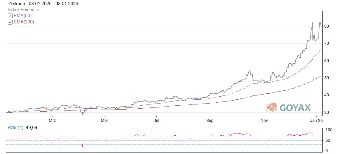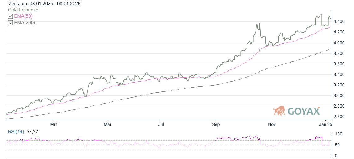 Das Tageshoch also nur noch knapp unter der 4.500 USD Marke. Venezuela, Grönland und Trump. Die geopolitische Lage spitzt sich zu. Aber Gold ist mittlerweile mehr als nur ein sicherer Hafen sondern in den Privathaushalten als Vermögensgut angekommen. Der EMA 50 aktuell bei 4.299,90 USD. Wir sehen aktuell keine Bremse für den Preisanstieg.