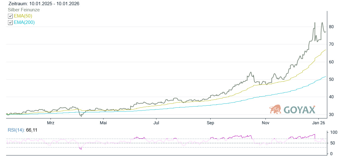 Die Feinunze Silber erzielte ein Tagestief bei 73,9400 USD und der höchste Preis am Donnerstag (08.01.2026) lag bei 78,9370 USD. Somit erreichte der Silberpreis eine Spanne von 5,00 USD oder 6,76 % im Tagesverlauf. Der letzte Preis am Donnerstag (08.01.2026) war dann mit 76,9650 USD im Vergleich zum Vortag (78,1385 USD) deutlich niedriger. Somit beläuft sich das Minus auf 1,50 % oder -1,1735 USD.