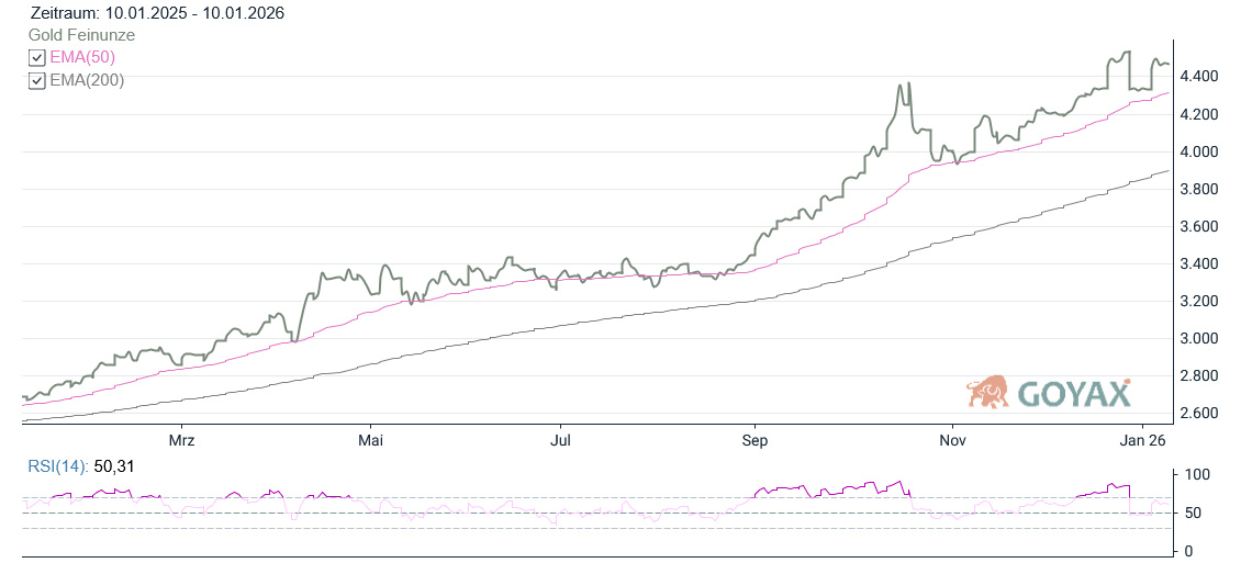 Wir werfen einen Blick zurück auf die Goldpreisentwicklung (ISIN: XC0009655157) am Donnerstag (08.01.2026). Zudem wird der EUR/USD und seine Auswirkungen auf den Goldpreis wie auch den Silberpreis im Euroraum angegeben.
