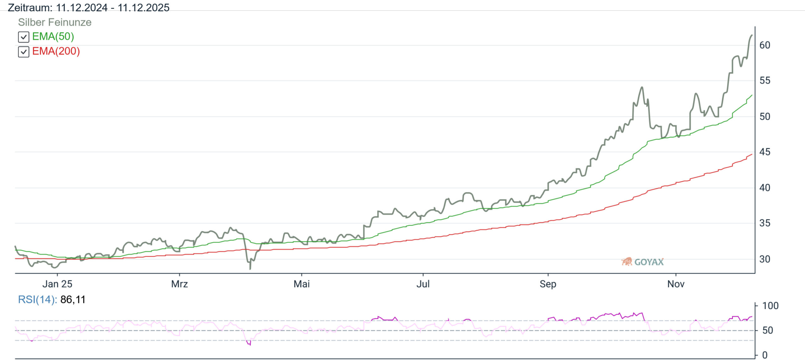 Damit überschreitet Silber erstmals in der Geschichte den Preis von 60 USD je Feinunze. Und aufgrund der hohen Nachfrage ist ein Ende dieses historischen Preisanstiegs nicht in Sicht. Lagerbestände auf Rekordtief bei steigender Nachfrage wie zum Beispiel aus Indien. Zudem kräftige Mittelzuflüsse in Silber-ETF. Heute morgen gab es schon die nächsten Rekordpreis oberhalb der 61 USD Marke.