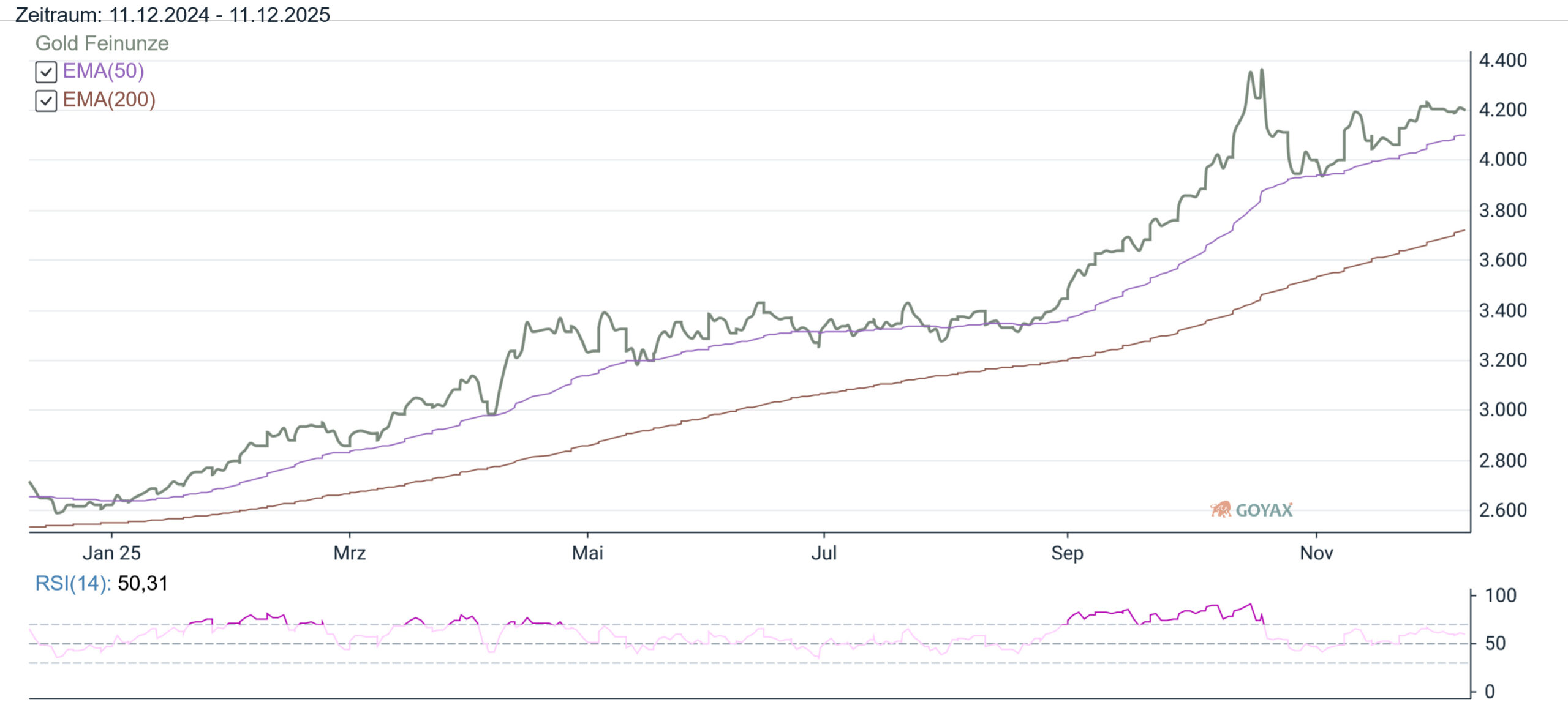 Dies hat natürlich Auswirkungen auf die Goldpreisentwicklung für uns in der Eurozone. Der mit den letzten Tageskursen errechnete Preis in Euro war am Vortag bei 3.601,08 EUR. Und für Dienstag (09.12.2025) errechnen wir für Gold in EUR mit 3.619,23 EUR einen höheren (18,146692878 EUR) Kurs. Somit liegt der Preis in EUR 0,50% über dem Vortagesniveau.