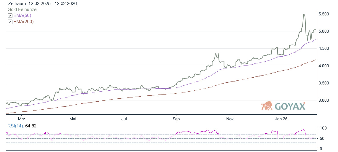 Aus technischer Sicht bleibt das Gesamtbild trotz der leichten Korrektur konstruktiv. Der vielbeachtete EMA 50 verläuft aktuell bei 4.756,19 USD und hat im jüngsten Rücksetzer erneut als tragfähige Unterstützung fungiert. Positiv zu werten ist zudem die Rückeroberung der psychologisch wichtigen Marke von 5.000 USD auf Schlusskursbasis. Dieses Niveau bleibt kurzfristig ein zentrales Signal für die Stabilität des übergeordneten Aufwärtstrends.