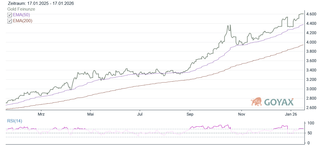 Dies hat natürlich Auswirkungen auf die Goldpreisentwicklung für uns in der Eurozone. Der mit den letzten Tageskursen errechnete Preis in Euro war am Vortag bei 3.973,16 EUR. Und für Donnerstag (15.01.2026) errechnen wir für Gold in EUR mit 3.975,23 EUR einen leicht höheren (2,08 EUR) Kurs. Somit liegt der Preis in EUR 0,05% über dem Vortagesniveau.
