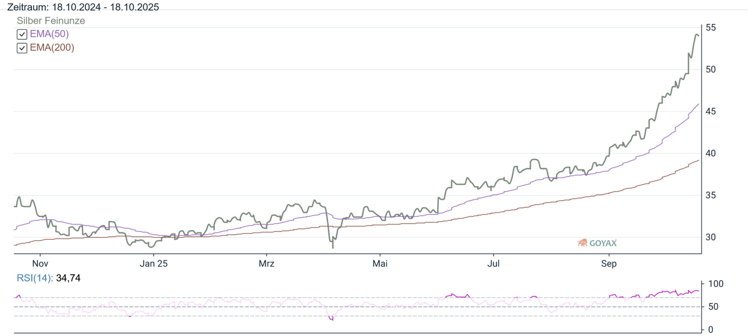 Die Feinunze Silber erzielte ein Tagestief bei 52,4795 USD und der höchste Preis am Donnerstag (16.10.2025) lag bei 54,1880 USD. Somit erreichte der Silberpreis eine Spanne von 1,71 USD oder 3,26 % im Tagesverlauf. Der letzte Preis am Donnerstag (16.10.2025) war dann mit 54,1880 USD im Vergleich zum Vortag (53,0335 USD) deutlich höher. Somit beläuft sich das Plus auf 2,18 % oder 1,1545 USD.