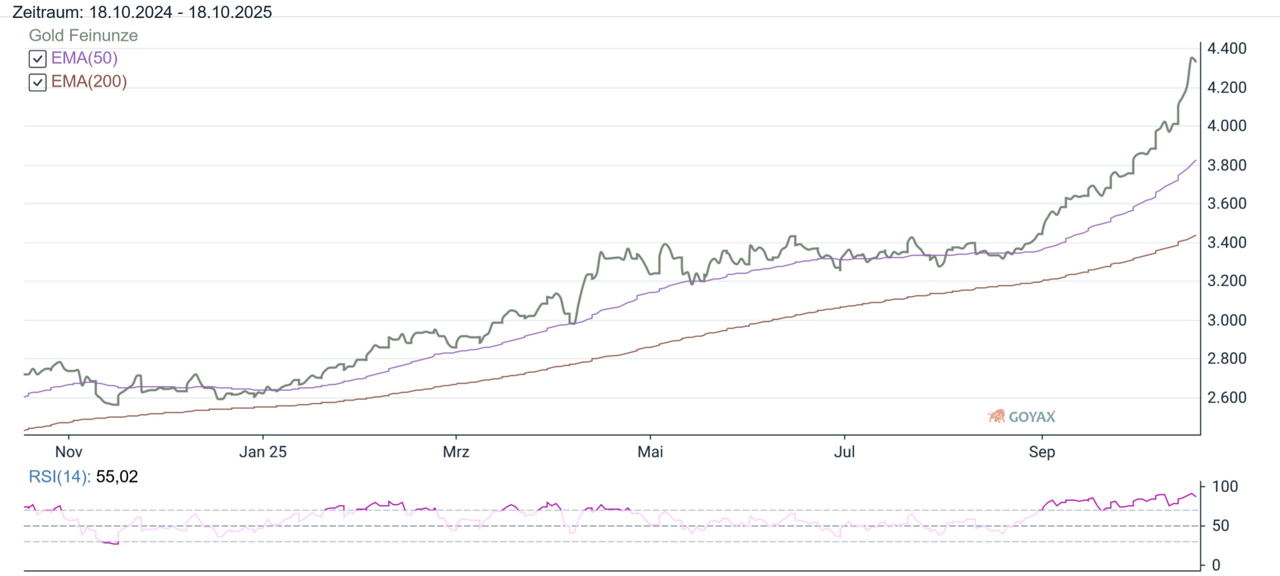 Dies hat natürlich Auswirkungen auf die Goldpreisentwicklung für uns in der Eurozone. Der mit den letzten Tageskursen errechnete Preis in Euro war am Vortag bei 3.613,30 EUR. Und für Donnerstag (16.10.2025) errechnen wir für Gold in EUR mit 3.704,23 EUR einen deutlich höheren (90,93 EUR) Kurs. Somit liegt der Preis in EUR 2,52% über dem Vortagesniveau.