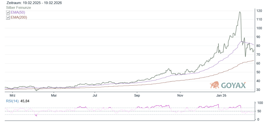 Technisch betrachtet bewegt sich Silber aktuell zwischen dem EMA 50 bei 81,35 USD und dem EMA 200 bei 63,42 USD. Während Gold klar über seinem mittelfristigen Durchschnitt notiert, befindet sich Silber in einer breiten Seitwärtszone zwischen mittelfristigem Widerstand und langfristiger Unterstützung.