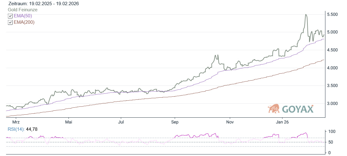 Der rechnerische Tagesdurchschnitt lag bei rund 4.926 USD und damit klar unter dem Eröffnungskurs – ein Zeichen anhaltenden Verkaufsdrucks über weite Strecken des Handels. Technisch interessant: Der EMA 50 verläuft aktuell bei 4.809,38 USD und wurde im Tagestief zwar angelaufen, hielt jedoch als Unterstützung. Damit bleibt der übergeordnete Aufwärtstrend trotz der kräftigen Korrektur intakt.