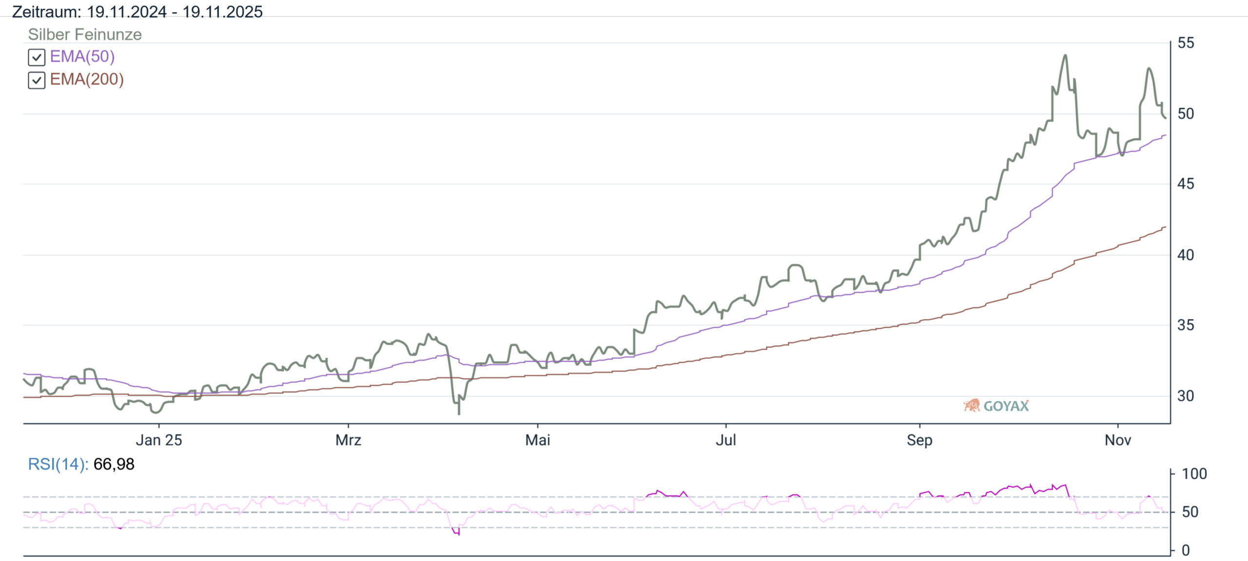 Beim Silberpreis in EUR haben wir natürlich ebenfalls die Auswirkungen der Preisveränderung beim EUR/USD Kurs zu beobachten. So können wir hier sehen, dass der mit den letzten Tageskursen errechnete Preis in Euro am Vortag bei 43,5272 EUR war. Hierzu im Vergleich errechnen wir als Ergebnis am Montag (17.11.2025) für Silber in Euro mit 43,3062 EUR einen niedrigeren (-0,2211 EUR) Kurs. Somit liegt die Preisveränderung in EUR bei 0,51 % unter dem Vortagesniveau.