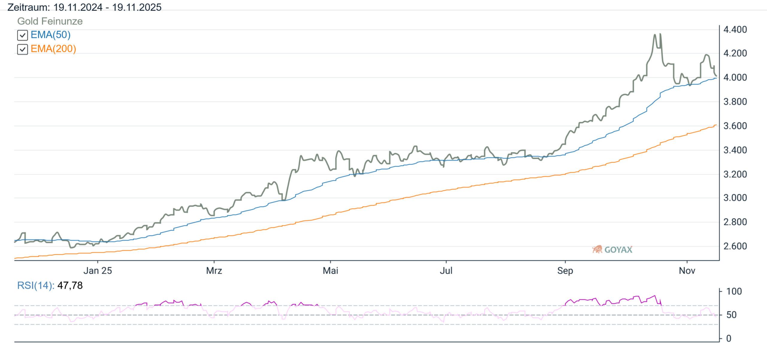 Dies hat natürlich Auswirkungen auf die Goldpreisentwicklung für uns in der Eurozone. Der mit den letzten Tageskursen errechnete Preis in Euro war am Vortag bei 3.511,52 EUR. Und für Montag (17.11.2025) errechnen wir für Gold in EUR mit 3.489,97 EUR einen niedrigeren (-21,56 EUR) Kurs. Somit liegt der Preis in EUR 0,61% unter dem Vortagesniveau.