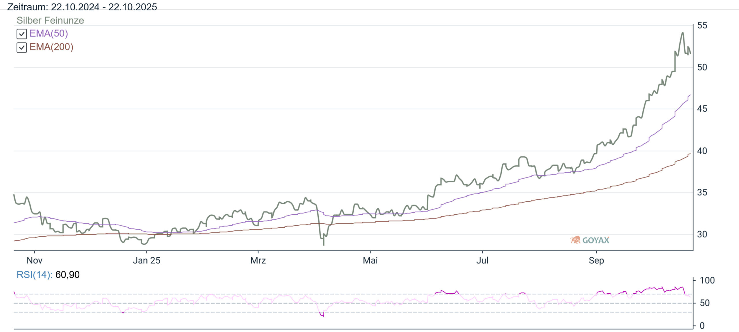 Beim Silberpreis in EUR haben wir natürlich ebenfalls die Auswirkungen der Preisveränderung beim EUR/USD Kurs zu beobachten. So können wir hier sehen, dass der mit den letzten Tageskursen errechnete Preis in Euro am Vortag bei 44,5490 EUR war. Hierzu im Vergleich errechnen wir als Ergebnis am Montag (20.10.2025) für Silber in Euro mit 45,0271 EUR einen deutlich höheren (0,4781 EUR) Kurs. Somit liegt die Preisveränderung in EUR bei 1,07 % über dem Vortagesniveau.