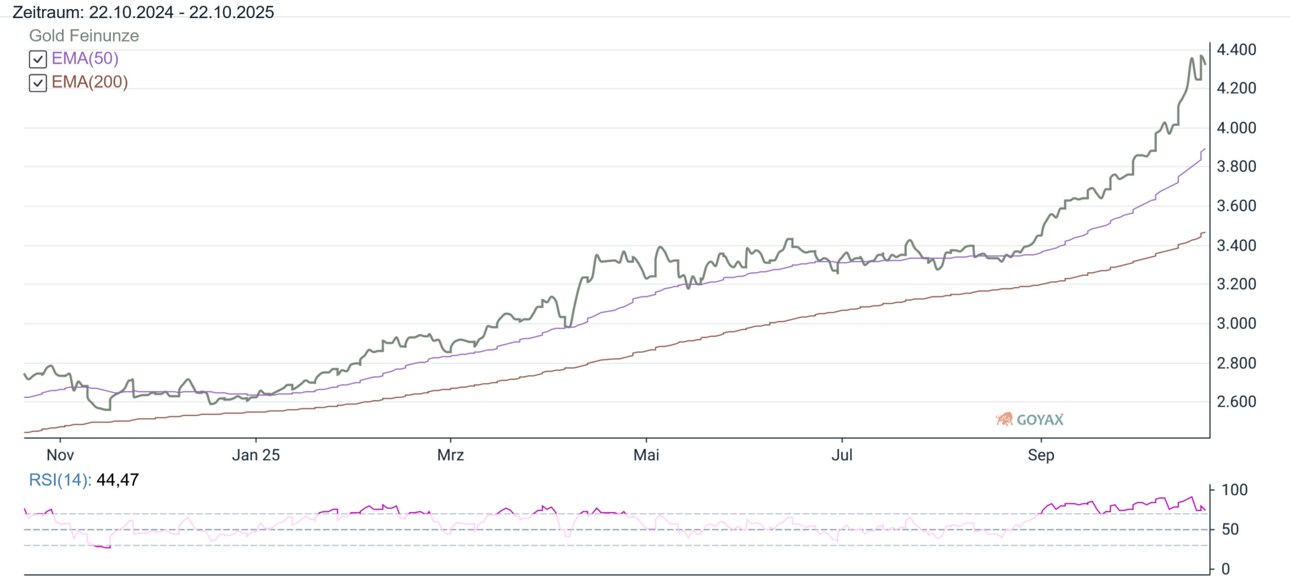 Und somit tatsächlich, wenn auch knapp – das 6.(!) All Time High in Folge. Darauf hatte nichts hingedeutet. Doch am Abend marschierte der Goldpreis und stieg mit 4.380,04 USD knapp über den Höhepunkt von Freitag Morgen (4.379,06 USD). Also weiter kein Ende in Sicht. Wer Mitte September gedacht hatte, bei 3.500 USD lohnt sich der Einstieg nicht mehr, wird sich mittlerweile ärgern.