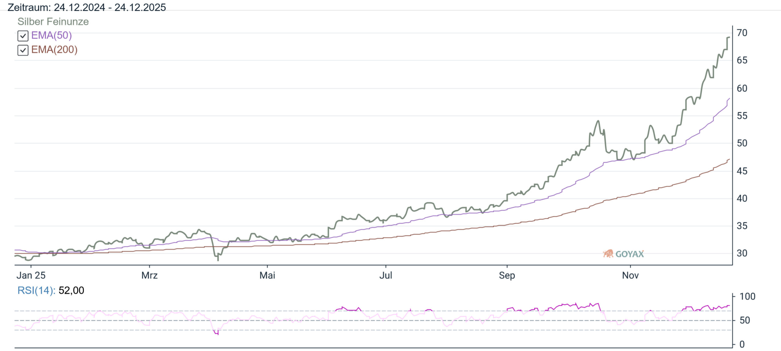 Beim Silber sind Rekordpreise zuletzt nichts Neues. Aber das war gestern, gerade im Hinblick auf die letzten Preiszuwächse, schon nochmal ein ordentlicher Sprung. Heute Morgen dann fast die 70 USD geknackt. Aktuelles Rekordhoch aus den Morgenstunden steht bei 69,9685 USD.