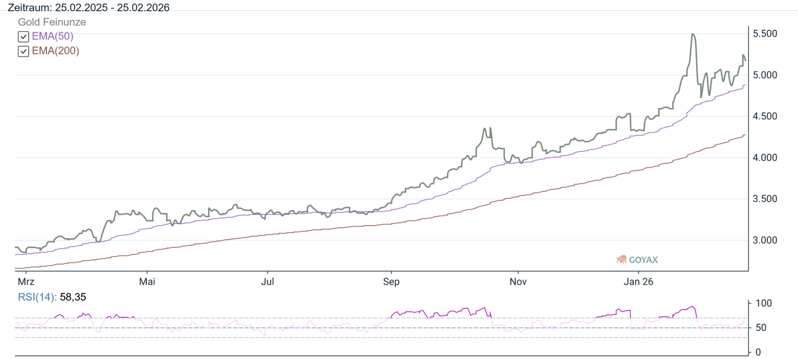 Auch aus technischer Sicht bleibt das Bild klar konstruktiv. Der Goldpreis notiert deutlich oberhalb des EMA 50, der aktuell bei 4.879,62 USD verläuft und den mittelfristigen Aufwärtstrend bestätigt. Mit einem aktuellen Kurs von 5.168,21 USD (08:11 Uhr) zeigt sich am Dienstagmorgen zwar eine leichte Konsolidierung, das übergeordnete Momentum bleibt jedoch intakt.