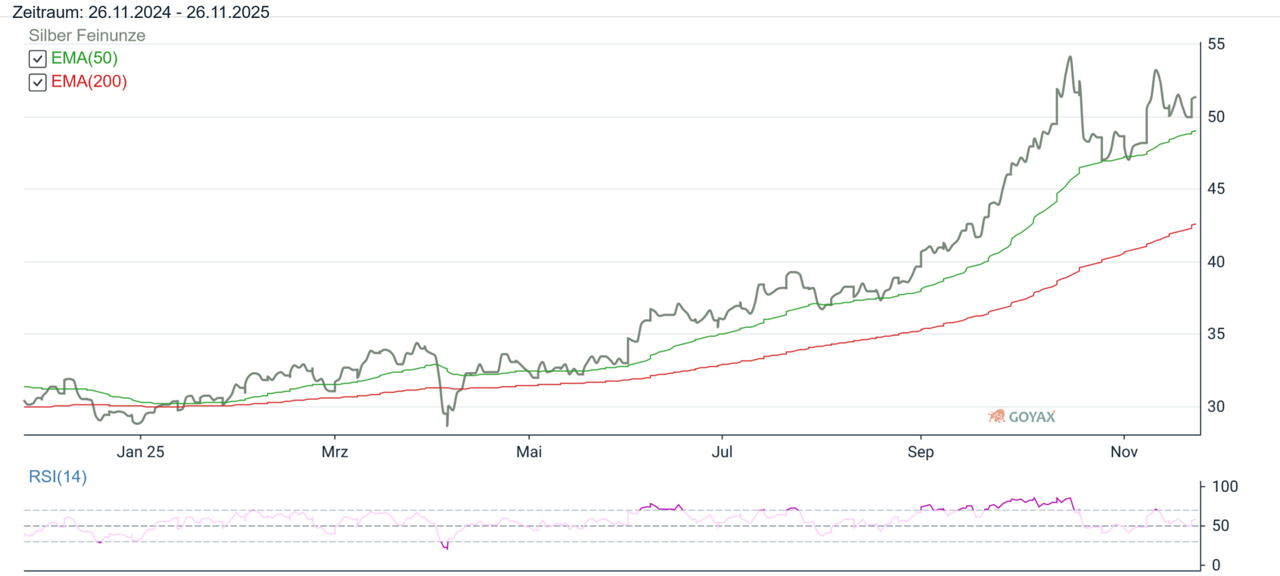 Beim Silberpreis in EUR haben wir natürlich ebenfalls die Auswirkungen der Preisveränderung beim EUR/USD Kurs zu beobachten. So können wir hier sehen, dass der mit den letzten Tageskursen errechnete Preis in Euro am Vortag bei 43,4748 EUR war. Hierzu im Vergleich errechnen wir als Ergebnis am Montag (24.11.2025) für Silber in Euro mit 44,5619 EUR einen deutlich höheren (1,0871 EUR) Kurs. Somit liegt die Preisveränderung in EUR bei 2,50 % über dem Vortagesniveau.