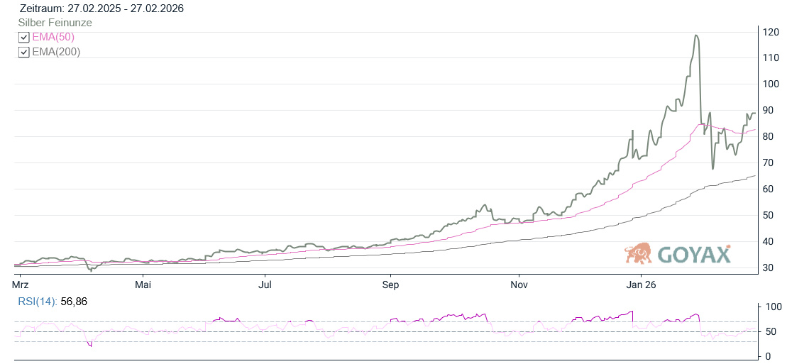 Silber startete bei 86,9785 USD in den Handel und entwickelte deutlich mehr Dynamik als Gold. Das Tagestief lag bei 86,6290 USD, das Tageshoch bei 91,2725 USD. Die Handelsspanne betrug damit 4,64 USD bzw. 5,36 %. Zum Handelsschluss notierte Silber bei 89,3020 USD und damit 2,1380 USD bzw. +2,45 % über dem Vortag (87,1640 USD). Technisch bleibt auch Silber klar im Aufwärtstrend. Der Kurs liegt oberhalb des EMA 50 (82,71 USD) sowie deutlich über dem EMA 200 (65,17 USD). Die starke Tagesperformance unterstreicht die relative Stärke gegenüber Gold.