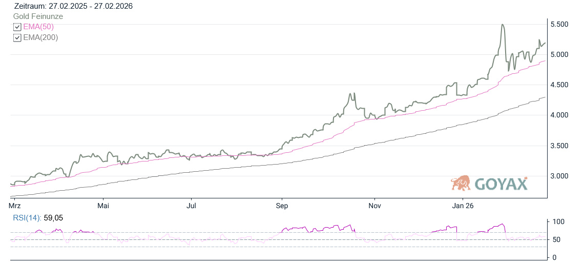 Nach dem deutlichen Rücksetzer vom Dienstag zeigte sich Gold somit stabilisiert. Technisch bleibt das übergeordnete Bild klar positiv: Der Kurs notiert weiterhin deutlich oberhalb des EMA 50 (4.901,51 USD) sowie komfortabel über dem EMA 200 (4.297,20 USD). Der mittelfristige Aufwärtstrend ist damit unverändert intakt. Am Morgen (07:53 Uhr) notiert Gold bei 5.193,55 USD und damit oberhalb des gestrigen Schlusspreises.