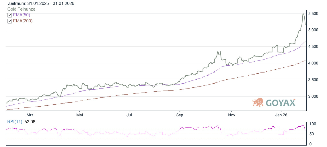 Nach der spektakulären Rekordjagd der Vortage blieb die Volatilität am Edelmetallmarkt außergewöhnlich hoch. Der Goldpreis startete am Donnerstag bei 5.435,88 USD in den Handelstag und setzte seine Rally im frühen Handel zunächst fort. Im Tagesverlauf markierte die Feinunze Gold ein neues Allzeithoch bei 5.594,06 USD. Anschließend setzte jedoch ein scharfer Ausverkauf ein, der den Preis bis auf ein Tagestief bei 5.114,80 USD zurückführte. Damit ergab sich eine außergewöhnlich breite Handelsspanne von 479,26 USD beziehungsweise 9,37 %. Zum Handelsschluss konnte sich Gold zwar wieder stabilisieren, notierte mit 5.378,80 USD jedoch leicht unter dem Vortagesniveau von 5.415,92 USD. Das Tagesminus belief sich auf 37,12 USD oder 0,69 %.