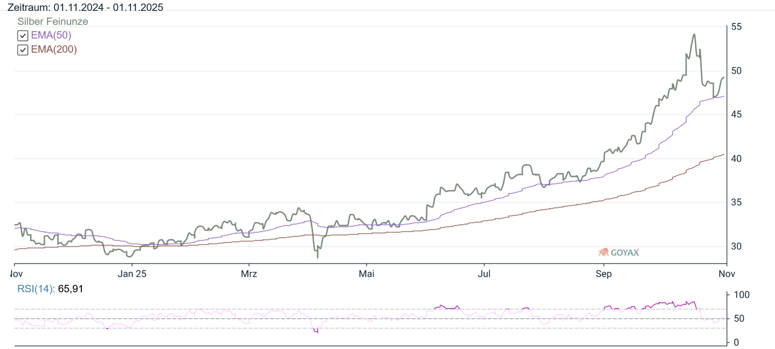 Beim Silberpreis in EUR haben wir natürlich ebenfalls die Auswirkungen der Preisveränderung beim EUR/USD Kurs zu beobachten. So können wir hier sehen, dass der mit den letzten Tageskursen errechnete Preis in Euro am Vortag bei 41,2078 EUR war. Hierzu im Vergleich errechnen wir als Ergebnis am Donnerstag (30.10.2025) für Silber in Euro mit 42,3533 EUR einen deutlich höheren (1,1455 EUR) Kurs. Somit liegt die Preisveränderung in EUR bei 2,78 % über dem Vortagesniveau.