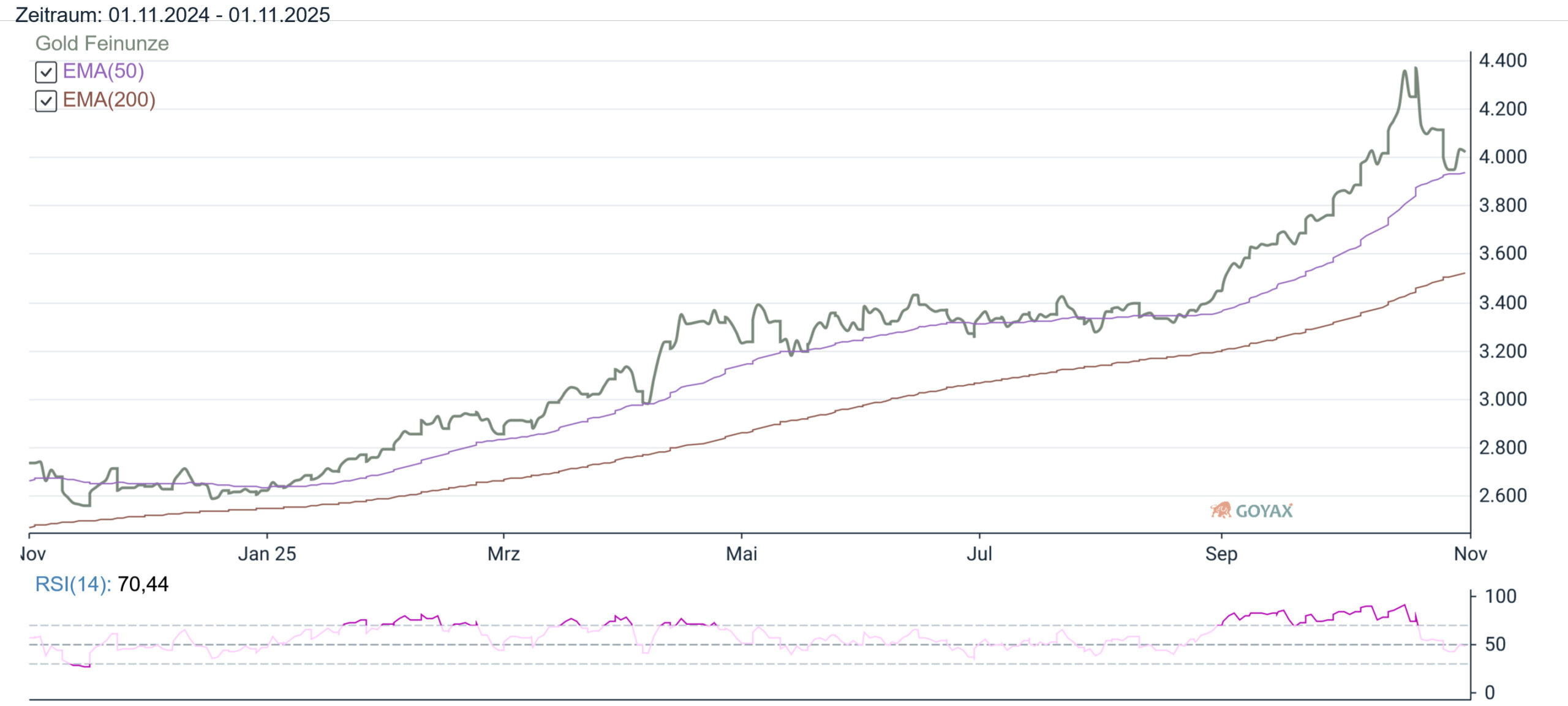 EMA 50 hat gehalten und jetzt die Rückkehr über die 4.000 USD Marke – und das obwohl eine weitere Zinssenkung von Powell in Frage gestellt wurde. Damit zeigt der Goldpreis bzw der Goldmarkt, seine Stärke. Denn auch die positiven Gespräche zwichen Trump und Xi konnten den langfristigen AUfwärtstrend nicht brechen. Gold bleibt gefragt.