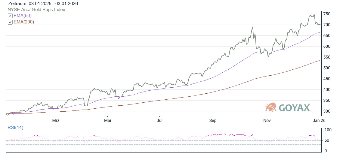 Zum Ende der KW 01 2026 konnte der NYSE Arca Gold BUGS Index (HUI) die 700er Marke retten, nachdem er vorher im Tagesverlauf auf Tages- und Wochentief bei 680,62 gefallen war. Zum Wochenschluss dann immerhin noch 701,06. Angesichts der 747,70 aus der Weihnachtswoche ein ebenfalls deutlicher Rückgang (- 46,64 / -6,24%). Das Wochenhoch wurde mit der Wocheneröffnung am Montag bei 747,73 gesetzt.