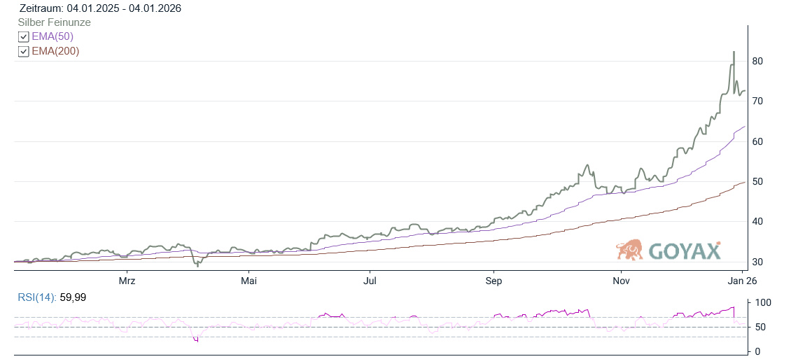 Und was hat 2025 uns gebracht. Ein absolutes Rekordjahr. Mit neuem Rekordpreis und einer aberwitzigen Performance. Den 31.12.2025 beendete der Silberpreis bei 71,7415 USD. Am 31.12.2024 lag der Silberpreis bei 28,873 USD – wir verzeichnen in 2025 also einen Preisanstieg von 42,8685 USD (148,47%). Diese Zahlen sprechen für sich und jede Kommentierung erübrigt sich. Aufgrund der globalen wirtschaftlichen Bedeutung von Silber und des Nachfrageüberschusses sehen wir aktuell keinen Grund, warum sich in 2026 etwas ändern sollte. Natürlich gilt es auch hier die Lücke zwischen Preis und EMA 50 charttechnisch zu beachten. Der EMA 50 beträgt zu diesem Wochenende 64,07 USD. Letzte Woche bei 60,87. Aber aus unserer Sicht wird der Silberpreis in der nächsten Woche nicht unter 70 USD fallen.