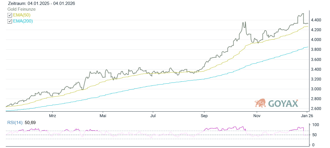 In der KW 01 2026 bewegte sich der Goldpreis zurück auf das Vorweihnachtsniveau. Wir bewegen uns also wieder unter 4.400 USD Marke. Die Handelswoche endete bei 4.328,63 USD. Zur Erinnerung: Die KW 51 endete bei 4.338,25 USD. Aber wir vergleichen zunächst natürlich mit dem Goldpreis letzte Woche. Und die KW 52 bescherte uns ja ein neues All Time High bei 4.549,56 USD und endete dann bei 4.532,38 USD. Also hat Gold auf Wochensicht einen Preisrückgang von 203,75 USD (- 4,50%) zu verzeichnen. Wir haben bereits am letzten Wochenende auf das große GAP zum EMA 50 hingewiesen und vor einem möglichen Preisrücksetzer gewarnt. Der EMA 50 ist diese Woche von 4.248,97 USD auf 4.273,43 angestiegen. Damit hat sich das GAP aus unserer Sicht auch geschlossen.