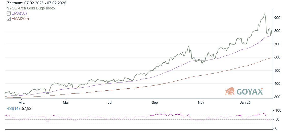 Der NYSE Arca Gold BUGS Index (HUI) zeigte sich in der KW 06 2026 stabil. Im Gegensatz zur Vorwoche, in welcher er deutlich durchgerüttelt wurde. Der Index startete von einem Vorwochenschluss bei 781,11 Punkten und erreichte am Mittwoch mit 832,20 Punkten sein Wochenhoch. Bereits am Donnerstag folgte dann bei 763,25 Punkten der Wochentiefpunkt. Am Freitag beendete der HUI die Woche dann bei 806,55 Punkte ab. Damit gewann der Index auf Wochensicht 25,44 Punkte, was einem Wochenplus von + 3,26 % entspricht. Es ist Berichtssaison und der Blick ist aktuell eher auf die Unternehmensergebnisse als auf die kurzfristigen Goldpreisausschläge gerichtet.