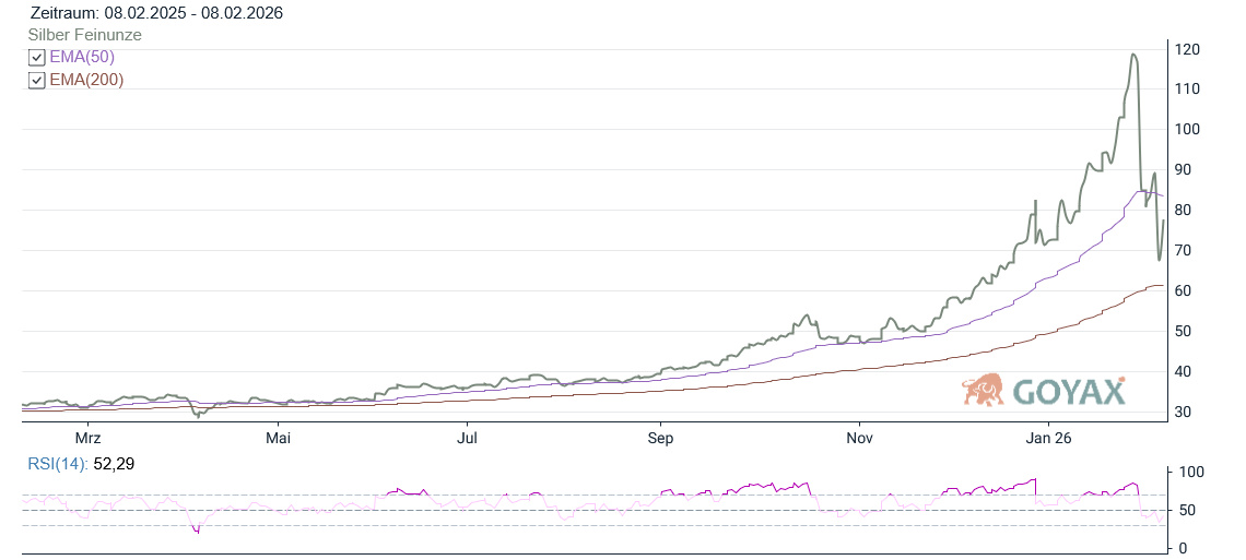 Zwar bleibt das langfristige Bild auch bei Silber konstruktiv, kurzfristig dominiert jedoch klar die Volatilität. Marktteilnehmer agieren selektiv, Absicherungsstrategien gewinnen an Bedeutung, während spekulative Engagements zurückgefahren werden. Das Chartbild zeigt deutlich, dass der Silberpreis in den Bereich zwischen den EMA 50 (83,39 USD) und dem EMA 200 (61,74 USD) zurückgefallen ist. Hierdurch ist der eindeutige charttechnische Aufwärstrend erst einmal durchbrochen. Es ist nicht auszuschließen, dass wir in den nächsten Tagen und Wochen in eine Seitwärtsbewegung innerhalb dieses Korridors fallen, bis das Durchbrechen eine der beiden gleitenden Durchschnitte ein neues Signal setzt.