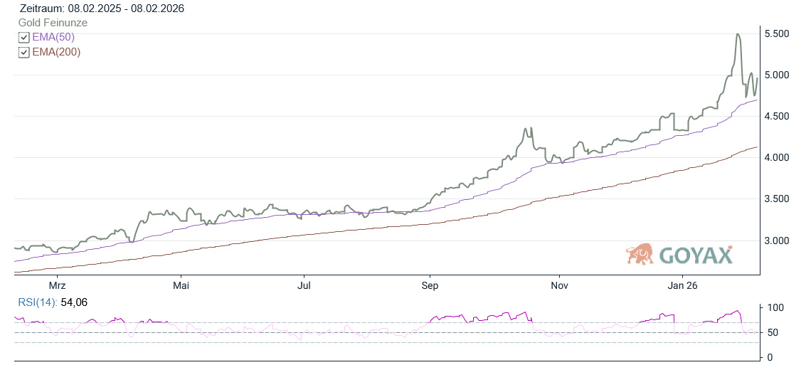 Die Handelsspanne verdeutlicht, wie angespannt das Marktumfeld weiterhin ist. Politische und geldpolitische Unsicherheiten sorgen für schnelle Richtungswechsel, gleichzeitig kehrt Gold zunehmend in seine klassische Rolle als Absicherung gegen systemische Risiken zurück. Die Entscheidung der EZB, den Leitzins am Donnerstag unverändert bei 2 % zu belassen, wirkte dabei stabilisierend und nahm zumindest kurzfristig weiteren Druck vom Markt. Aus charttechnischer Sicht bleibt der übergeordnete Aufwärtstrend intakt. Trotz der extremen Ausschläge notiert Gold weiterhin über zentralen langfristigen Durchschnittslinien. Die Entwicklung deutet darauf hin, dass das Vertrauen in Gold als Wertspeicher schneller zurückkehrt als gedacht, ein Signal, das auch institutionelle Investoren zunehmend berücksichtigen. Wie dem regelmäßigen Leser bekannt ist blicken wir gerne auf den EMA 50 (aktull bei 4.707.06 USD). Dieser hat zum Tagesende beim Goldpreis jeweils als Unterstützung gehalten. Ein starkes Zeichen für einen intakten Aufwärtstrend.