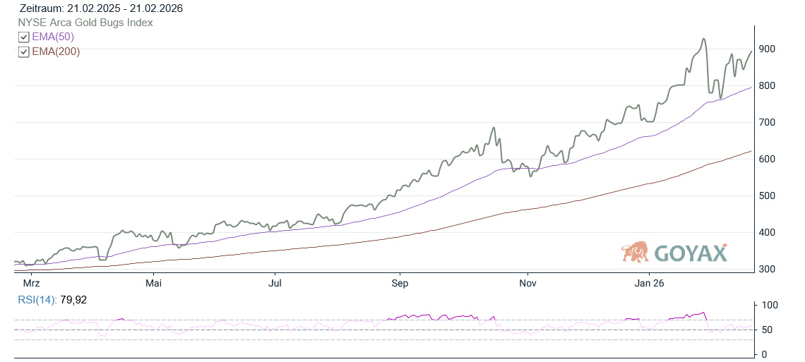 Der NYSE Arca Gold BUGS Index (HUI) knüpfte in der abgelaufenen Handelswoche nahtlos an die dynamische Entwicklung der Vorperiode an. Nach dem feiertagsbedingt ruhigen Wochenauftakt setzte der Index am Dienstag mit einem Wochentief bei 816,75 Punkten zunächst etwas tiefer an, stabilisierte sich jedoch rasch. Im weiteren Verlauf gewann der Markt deutlich an Zugkraft. Getragen von der festen Tendenz am Goldmarkt und anhaltendem Interesse an Minenwerten markierte der HUI am Freitag mit 895,55 Punkten das Wochenhoch und schloss nur knapp darunter bei 893,17 Punkten. Auf Wochensicht ergibt sich damit erneuter Zugewinn von 21,88 Punkten (+ 2,51%), der das technisch verbesserte Gesamtbild untermauert.