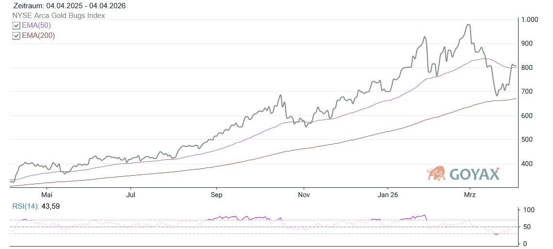 Auch die Goldaktien konnten deutlich zulegen. Der NYSE Arca Gold BUGS Index stieg in der KW 14 2026 von 731,91 Punkten in der Vorwoche auf 808,57 Punkte. Das entspricht einem kräftigen Plus von 76,66 Punkten beziehungsweise 10,47 %. Damit zeigen die Goldproduzenten erneut ihre typische Hebelwirkung gegenüber dem Goldpreis. Treiber dieser Bewegung ist natürlich vorrangig der Goldpreis. Zusätzlich sorgte ein zwischenzeitlich schwächerer US-Dollar für Unterstützung bei Rohstoffen und Minenwerten. Gleichzeitig verbesserte sich die Risikostimmung an den Märkten leicht, was besonders zyklische Werte wie Goldproduzenten begünstigte.