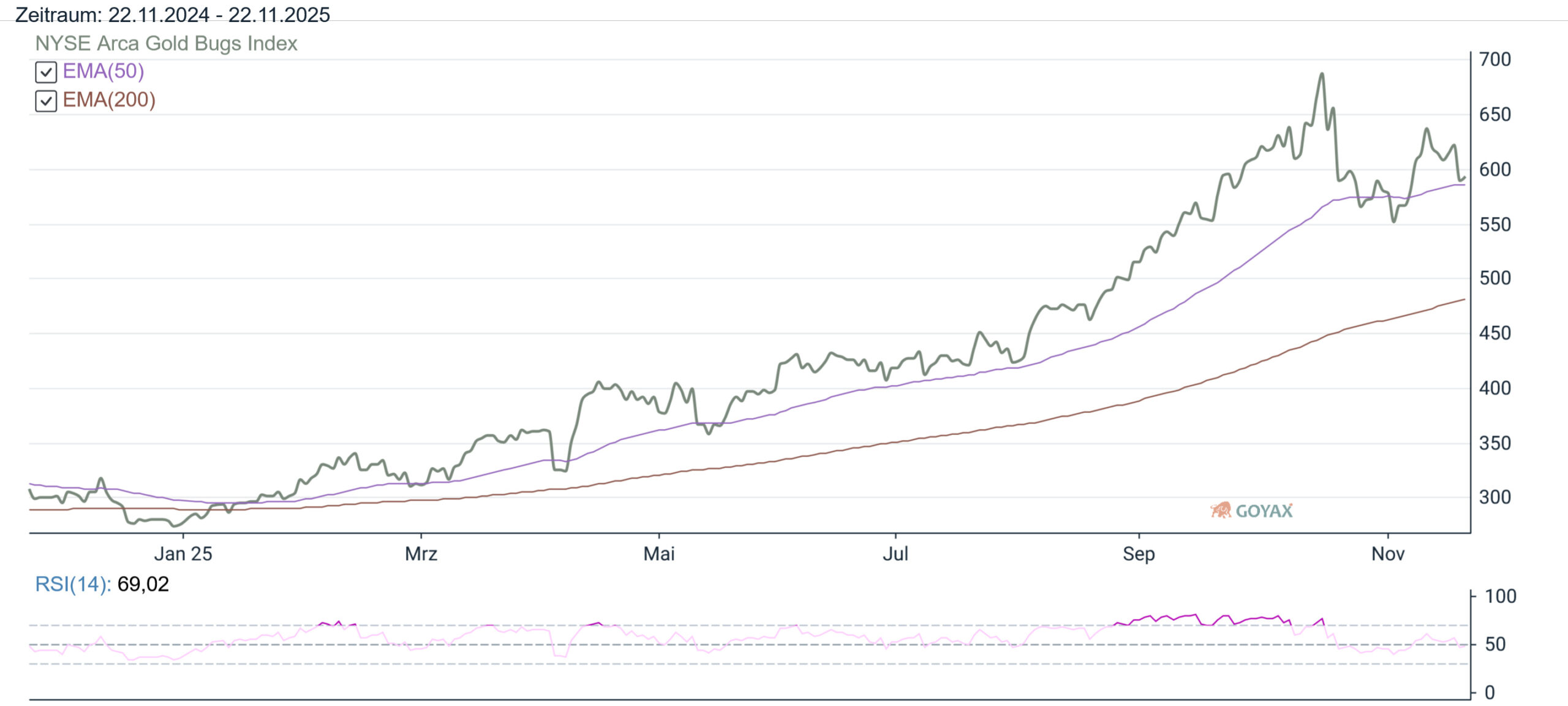 In der KW 47 2025 zeigte sich NYSE Arca Gold BUGS Index (HUI) zunächst stabil. Montag bis Mittwoch auch im Tief über 600 Punkte. Am Donnerstag knickte er dann ein, erreichte am Freitag bei 583,84 sein Wochentief und es gelang nicht, zum Wochenende die Marke von 600 Punkte noch einmal zurück zu erorbern. Wochenschluss bei 594,03. Dies bedeutet gegenüber der Vorwoche bei 615,20 ein Verlust von 21,17 Punkte (- 3,44 %).