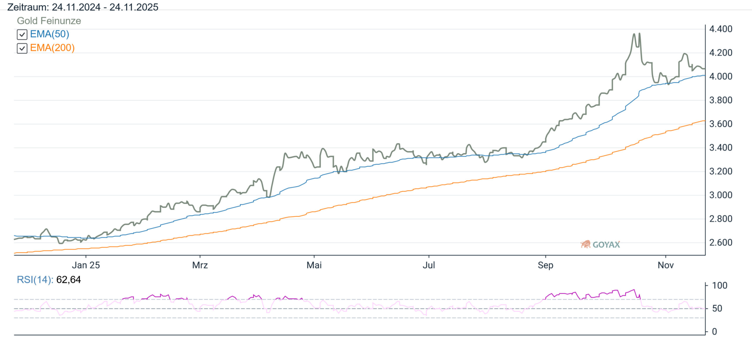 Auf dem ersten Blick ist in der KW 47 2025 bei Gold nicht viel passiert. Rein auf Wochensicht sehen wir eine Preisveränderung von 4.080,74 USD auf 4.064,90 USD. Also einen Preisrückgang von 15,84 USD / 0,39%. So wie der Satz angefangen wurde ist klar, es folgt ein „aber“. Und hier ist es. Aber in der abgelaufenen Kalenderwoche sahen wir ein Wochentief bei 3.999,96 USD und am Montag ein Tagestief bei 4.008,66 USD. Was wollen wir damit sagen? In Verbindung mit dem EMA 50, der diese Woche die 4.000 USD Marke durchbrochen hat, bildet sich eine starke Unterstützung für den Goldpreis im Bereich 4.000 USD. Ein Boden, von welchem der Angriff auf neue Rekordpreise folgen könnte.