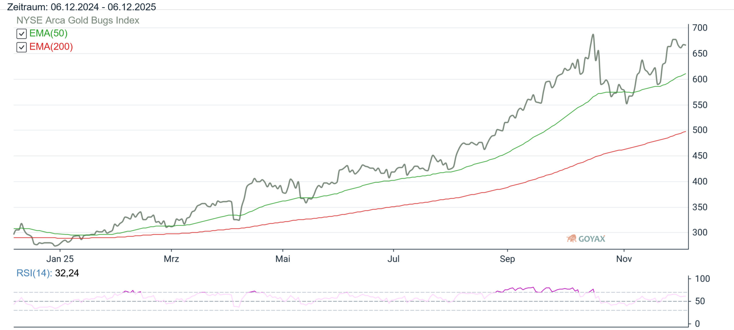 In der KW 49 2025 ging es für den NYSE Arca Gold BUGS Index (HUI) etwas runter. Aufgrund der geringen Veränderung auf Wochensicht könnte man auch von einer Stabilisierung auf hohem Niveau sprechen. Alles eine Frage des Blickwinkels. Zur Einordnung des Blickwinkels schauen wir auf Schwankungsbreite in dieser Woche. Wochentief bei 655,61 am Donnerstag und Wochenhoch bei 688,49 am Montag. Also ein Handelsbereich von 32,88 Punkten. Und zum Wochenschluss bei 666,15. Das sind 11,33 Punkte (- 1,67%) weniger als letztes Wochenende (677,48).