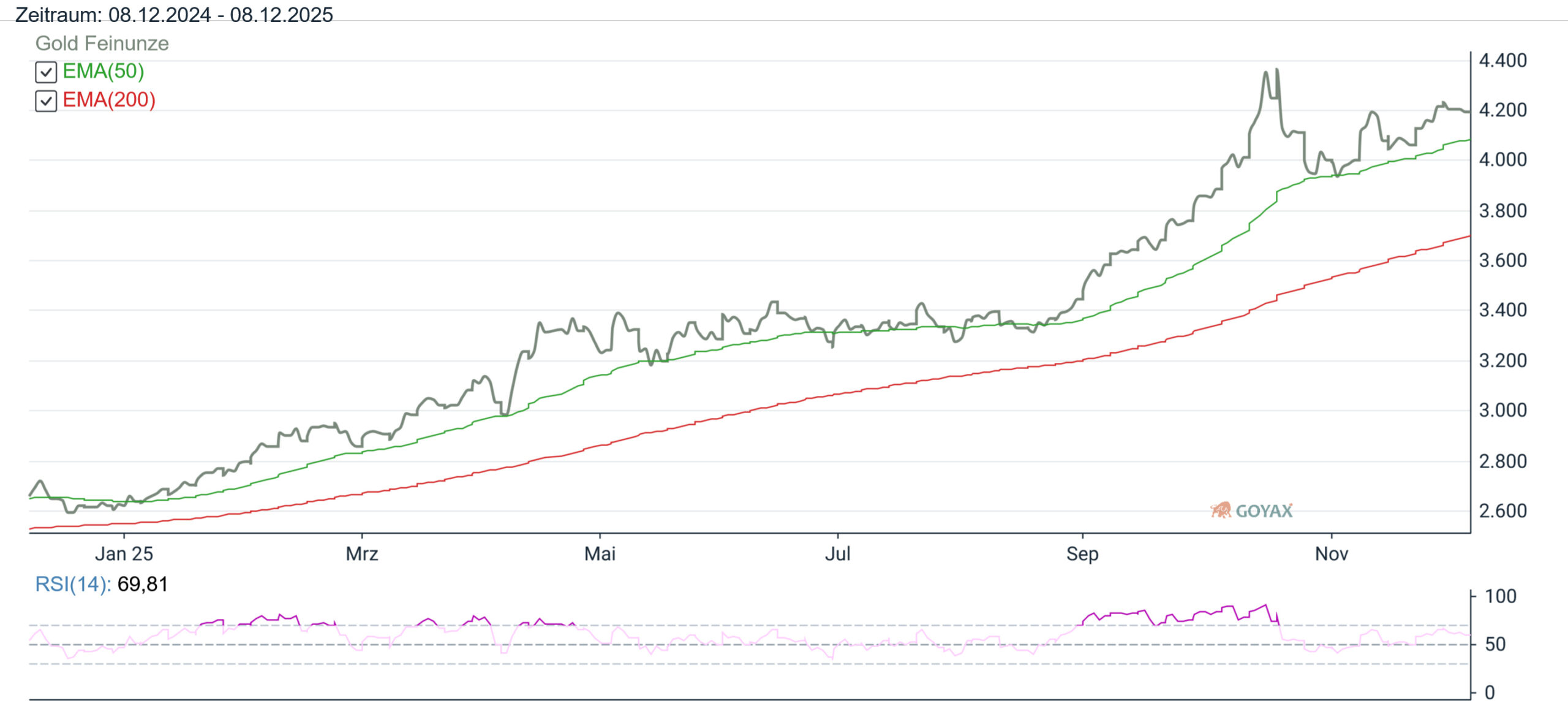 Gold startete stabil in die KW 49 2025 und behauptetw sich weiterhin über der Marke von 4.200 US-Dollar. Besonders die anstehenden US-Inflationsdaten und die nächste Sitzung der Federal Reserve am kommenden Mittwoch sorgen für Aufmerksamkeit am Markt. Gleichzeitig signalisieren weichere Arbeitsmarktdaten aus den USA eine mögliche wirtschaftliche Abkühlung – ein Szenario, das die Hoffnung auf Zinssenkungen stärkt und Gold zusätzlichen Auftrieb verleiht. Umso enttäuschender, dass Gold ausgerechnet zum Wochenausklang unter die Marke von 4.200 USD gerutscht ist. Und das obwohl am Freitag mit 4.258,12 USD fast das Wochenhoch vom Montag (4.263,86 USD) erreicht wurde. So stehen „nur“ 4.19462 USD zum Wochenausklang auf der Preistafel. Dies ist gleichbedeutend mit einem Verlust auf Wochensicht von 1,04% (- 43,94 USD).