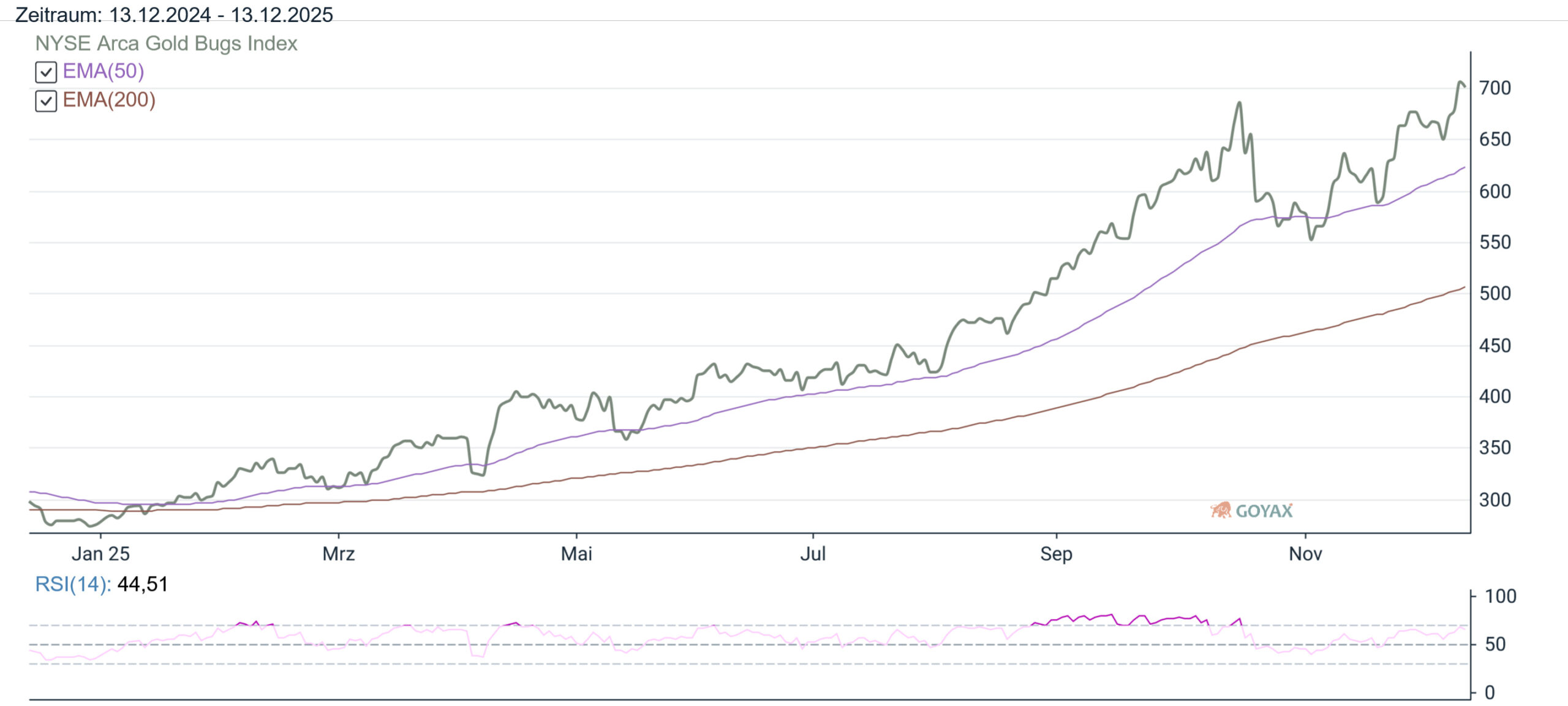 In der KW 50 2025 ging es für den NYSE Arca Gold BUGS Index (HUI) wieder deutlich rauf. Kein Wunder, wenn man sich anschaut wie die Metallpreise aktuell performen. Aktuell ist es ja wortwörtlich eine Goldgrube. Und so sehen wir am Freitag ein Wochenhoch von 722,73 Punkten und auch der Wochenschluss liegt über der 700 Punkte Marke: 700,91. Letztes Wochenende waren wir bei 666,15. Also ein Zuwachs von 34,76 Punkte (+ 5,22 %). Vielleicht mal eine kleine Erinnerung. Das Jahr 2024 wurde bei 275,61 beendet. Also im Jahr 2025 bisher ein Zuwachs von 425,30 Punkten (154,31 %).